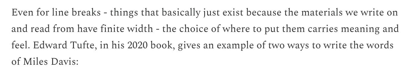 Even for line breaks - things that basically just exist because the materials we write on and read from have finite width - the choice of where to put them carries meaning and feel. Edward Tufte, in his 2020 book, gives an example of two ways to write the words of Miles Davis:
