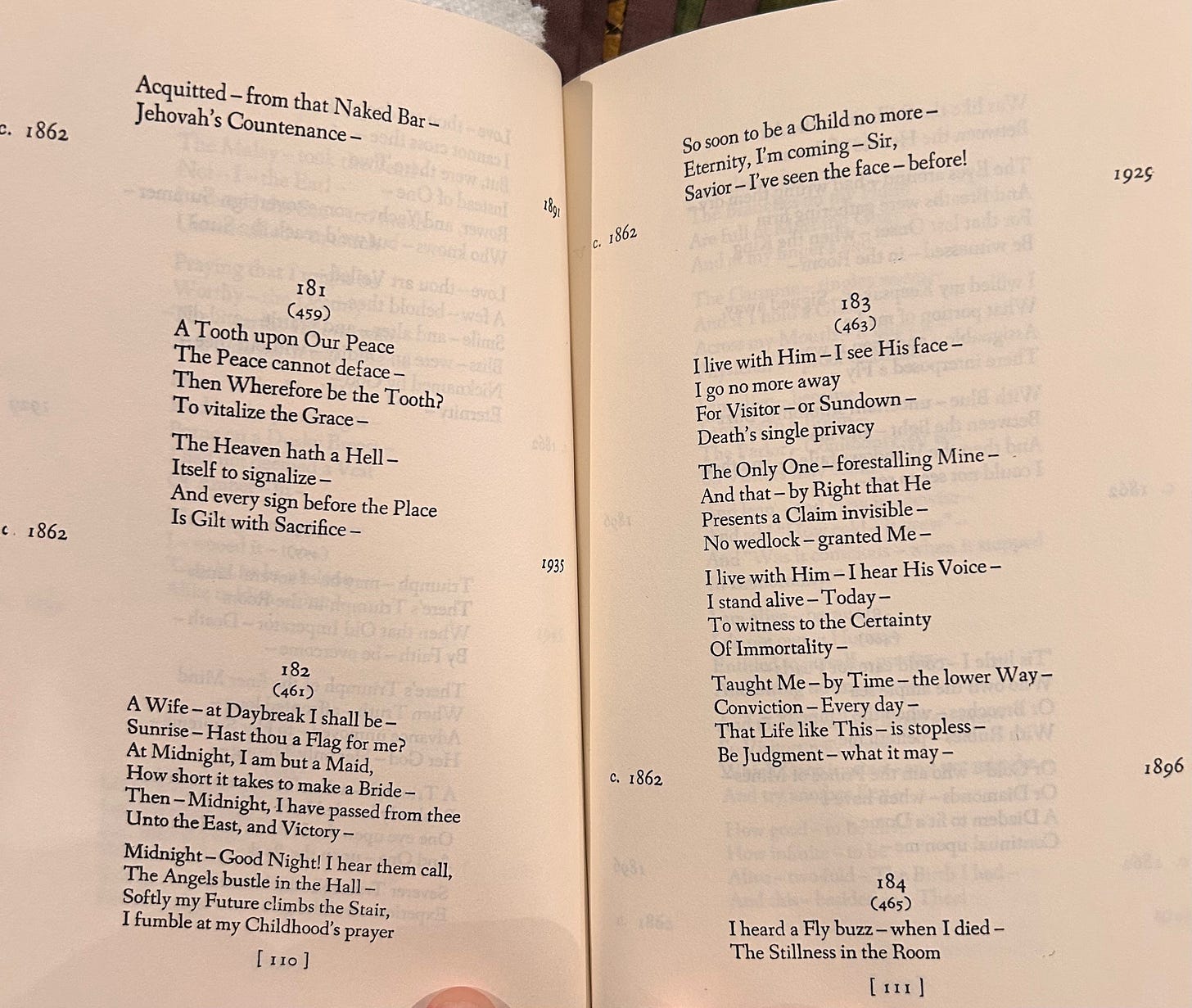 In the 1890 editing, the meter is off, the musicality badly damaged. (And even what I am calling the “original” is badly chained by the demands of Type. Dickinson wrote her poems by hand, and her dashes varied in length and in angle; Typographers have only a handful of dash characters to choose from).